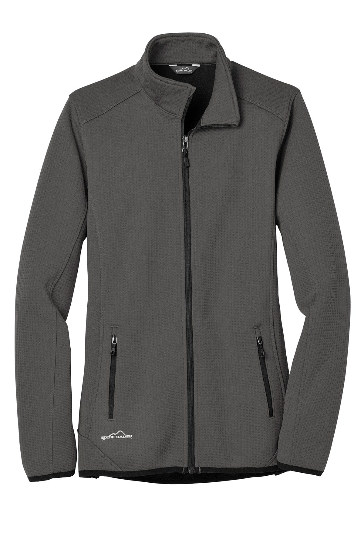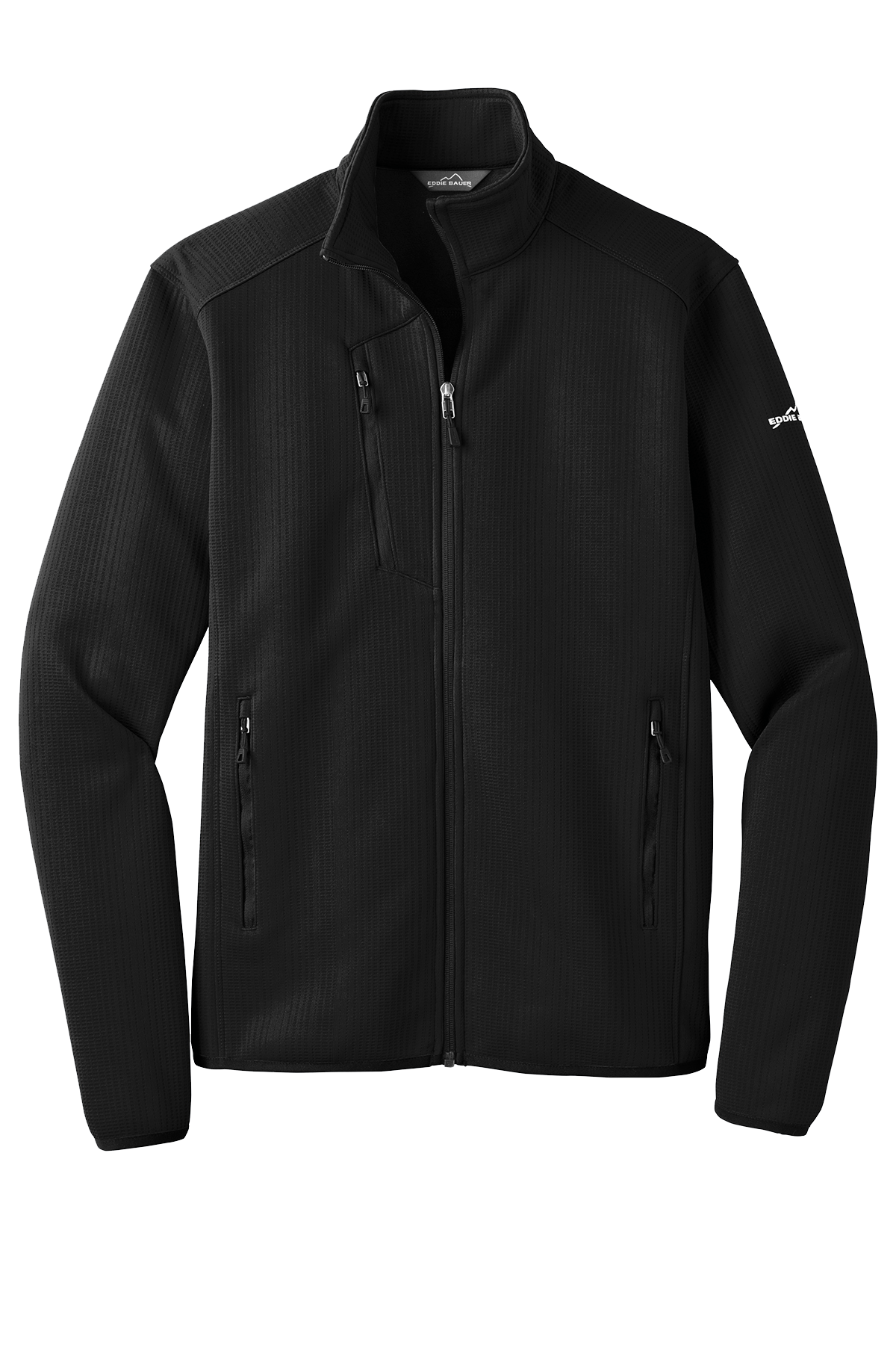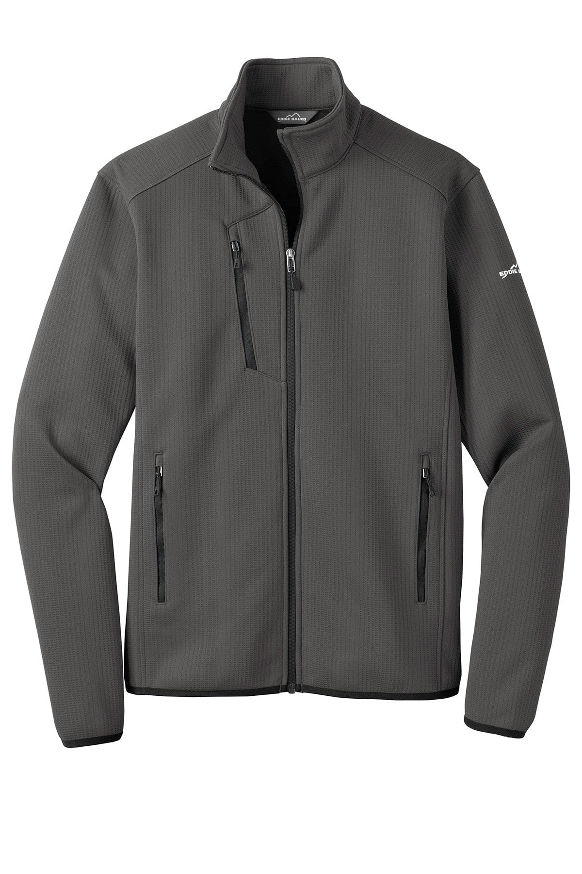 - Contrast heat transfer Eddie Bauer logo on left sleeve