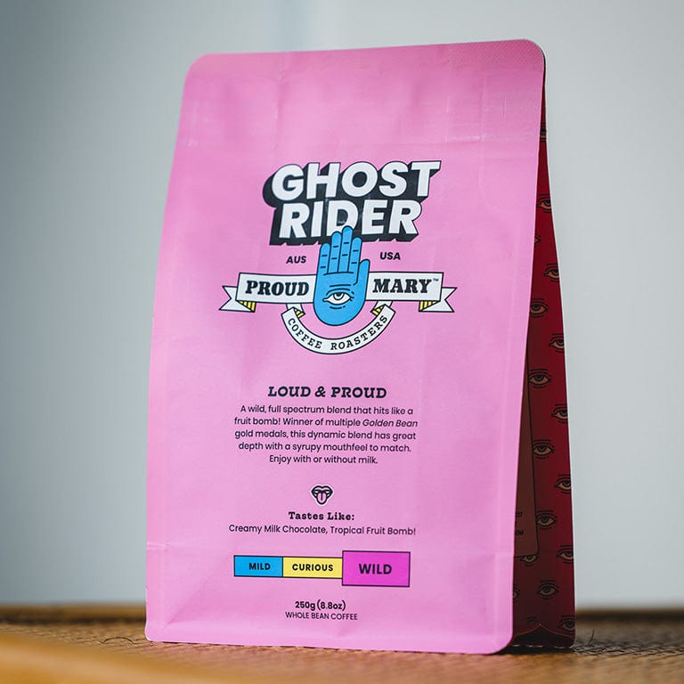 This blend has won 5 medals at the Golden Bean awards, including 3 Gold medals back to back. Wild by Blend standards, Ghost Rider is comprised of naturally processed coffees from Ethiopia and Brazil, one fruit-driven and the other creamy AF.