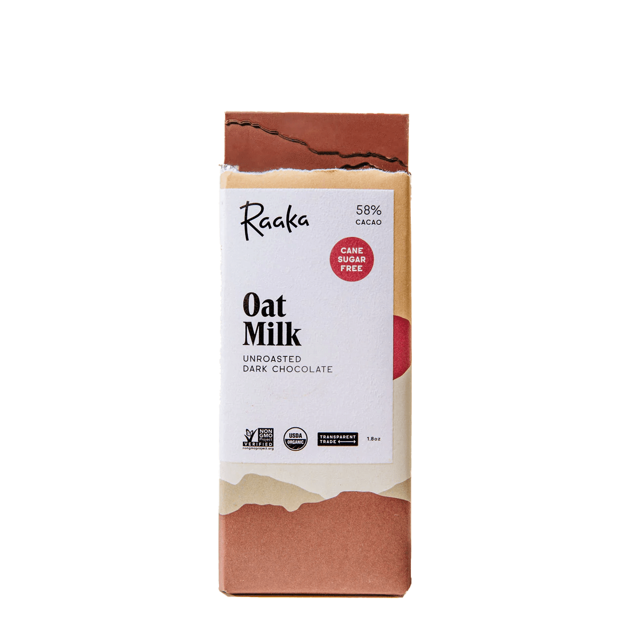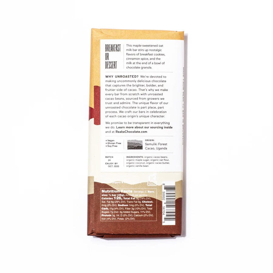 This bar reminds us of homemade granola covered in chocolate; it could be breakfast, but it could also be dessert. Cane sugar-free. Cacao from Semuliki Forest in Uganda brings fruity cocoa notes, while gluten-free oat flour creates the cookie bite. We sweeten this bar with maple sugar for a rounded, warm finish. At 58% cacao, this is one of our signature dark milk chocolates; sweet and creamy but still cacao forward and 100% vegan.