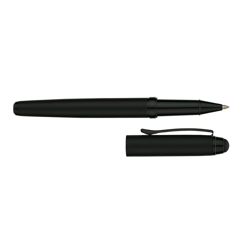 The Zest brass and stainless steel rollerball pen has a classic cap-off design, matte black finish, gloss black clip and trims, and a capacitive stylus that works with touch screen devices.