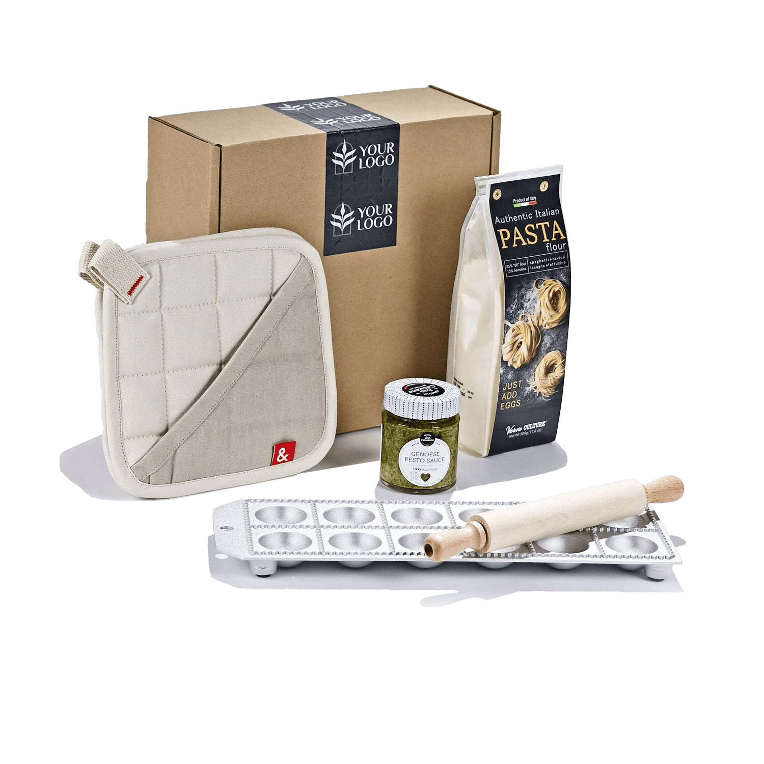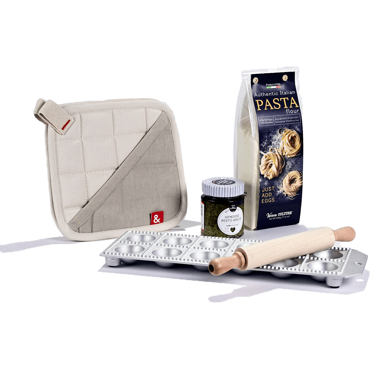 Give a company gift that your recipients would never purchase for themselves! These thoughtful gift boxes include a ravioli mold (with roller), Italian pasta flour, Hedley & Bennett pot holders, and specialty Genovese pesto sauce. They’re basically all the ingredients your recipients need for a beautiful, high-quality meal at home with the people they love the most.