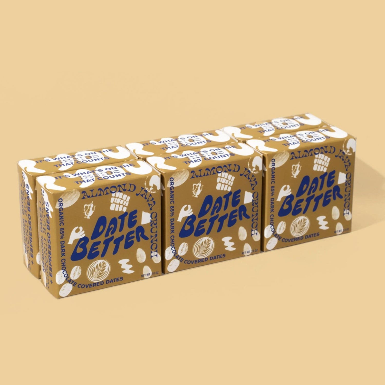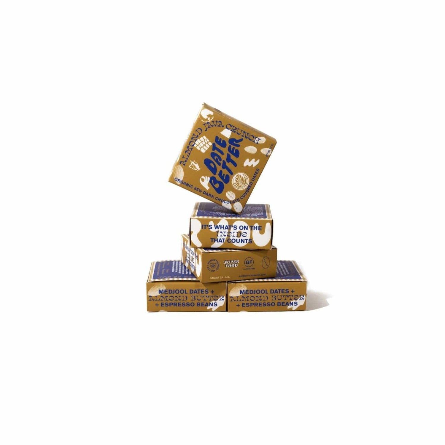 Almond Java Crunch checks all the boxes. Featuring almonds that are high in monosaturated fats and crunchy expresso beans that provide a pick me up when you need it. This flavor combo is soulmate material. **Medjool Dates are filled w/ a creamy almond butter w/ bits of espresso beans then covered in 85% dark chocolate and topped with flaky sea salt.