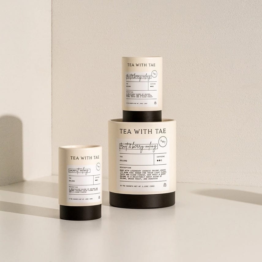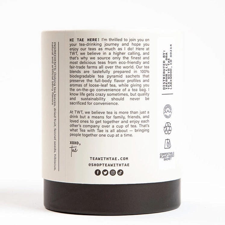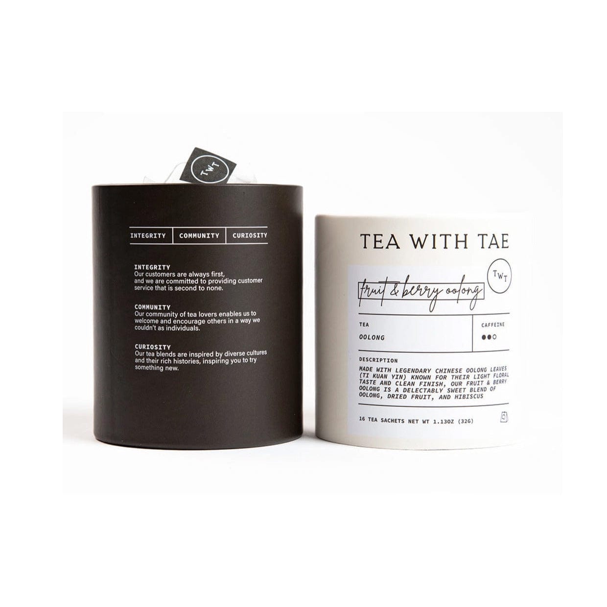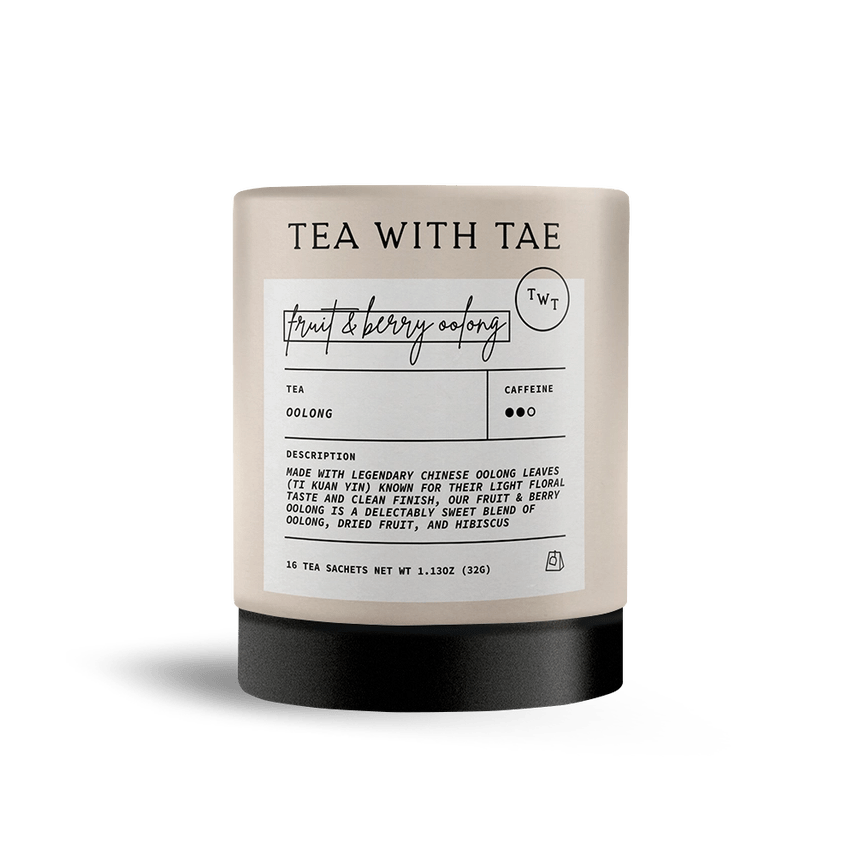 FRUIT & BERRY OOLONG: One of Tea with Tae's bestsellers and most flavorful teas. Made with legendary Ti Kuan Yin oolong leaves from China, our Fruit & Berry Oolong is a delectably sweet (but sugar-free!) blend of oolong, real dried fruit bits, and hibiscus flowers.