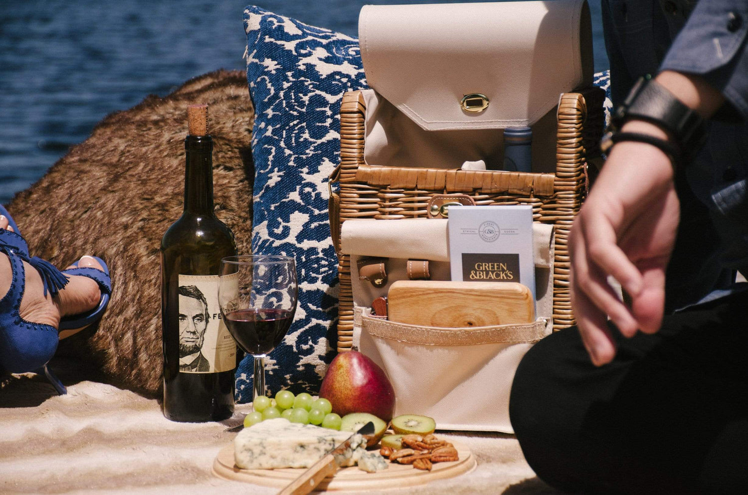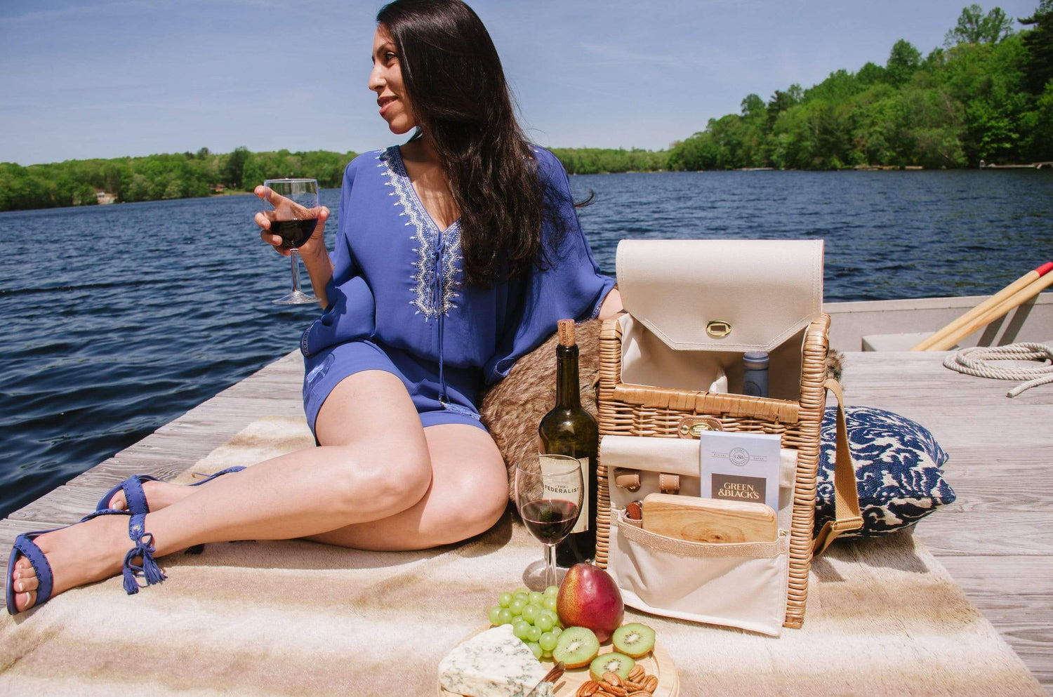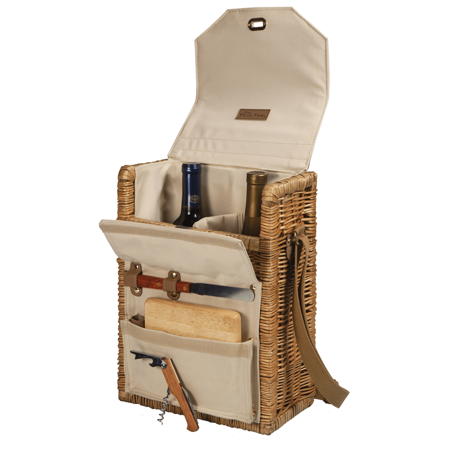 This uniquely sophisticated wine and cheese basket is perfect for picnics, concerts, or travel. The Corsica is an insulated wine and cheese basket with divided compartment for two wine bottles and an exterior canvas pocket to hold the included accessories: 1 hardwood cutting board (6" x 6"), 1 stainless steel waiter-style corkscrew, and 1 stainless steel cheese knife with wooden handle. Made of willow and tan-colored 600D polyester canvas with premium leatherette accents. The adjustable shoulder strap makes it easy to carry. Convenient and practical, the Corsica is perfect for wine and cheese lovers and makes a wonderful gift.