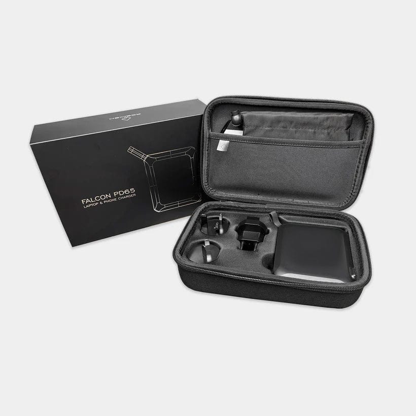 Introducing our most powerful and versatile charger yet.  The Falcon pd65 is an all-in-one charger featuring Magsafe "Snap-on handsfree" charging and 65 watts of power output for charging (USB-C compatible) laptops.  The Falcon PD65 is the perfect travel charger with its compact design and built-in plug-and-charge AC adapter.  Each unit is packed individually in a travel hardshell case and includes AUS, EU, and UK international adapters.