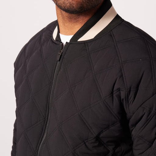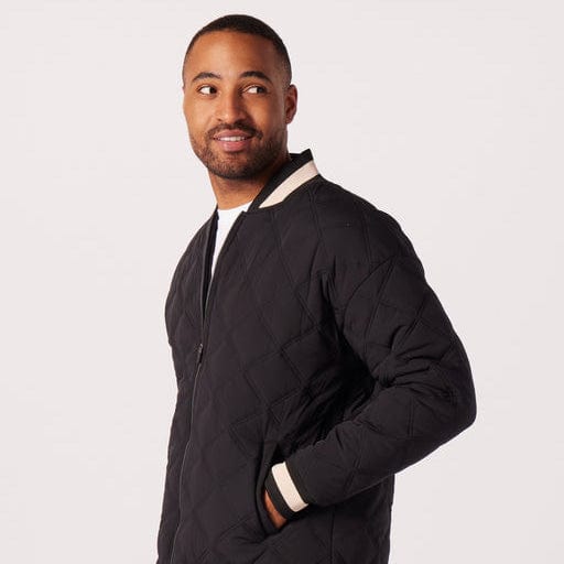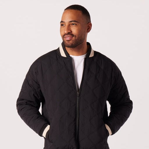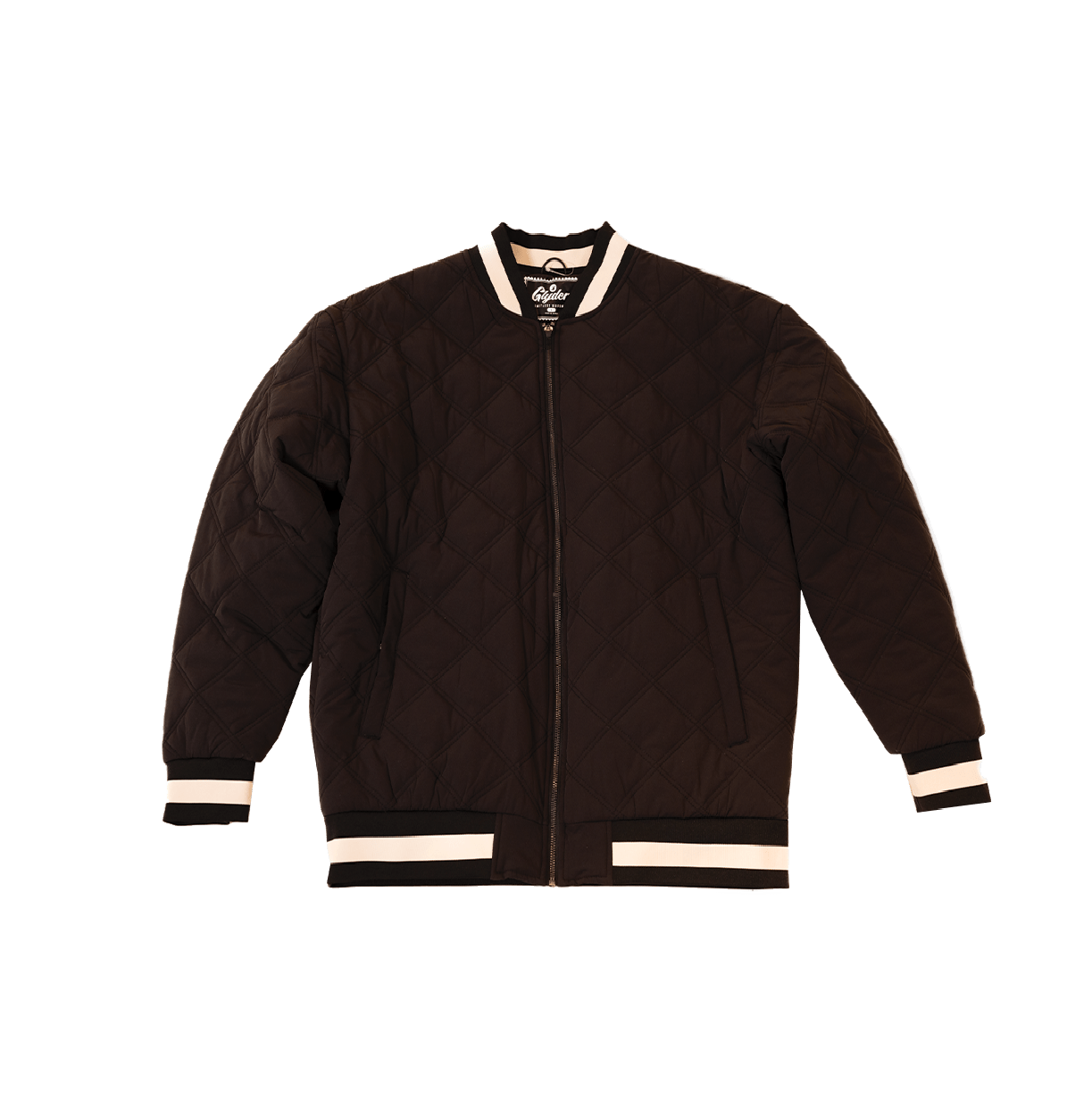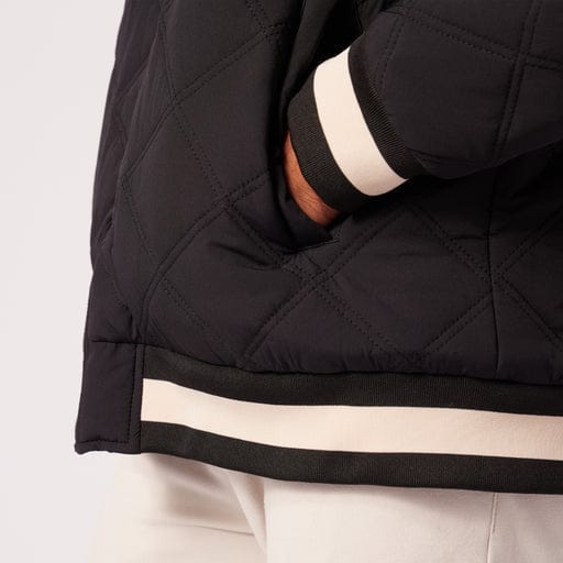 A clean and sophisticated version of the classic letterman. Contrast cuffs on the neckline, sleeves, and bottom of the jacket are reminiscent of the collegiate look, while the oversized fit and inner pockets make it a great outer layer to throw over your outfit in the gym, after class, or on the go.