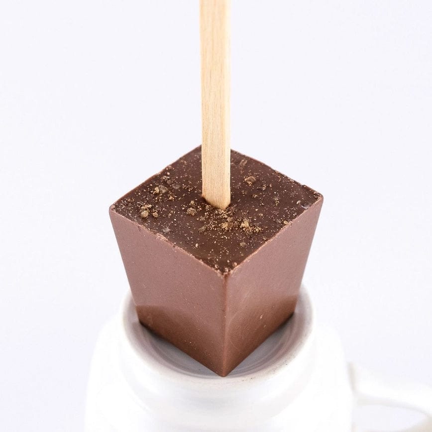 A 1.5-ounce service for one of our premium couverture hot chocolate on a stick. Dunk into a mug of hot milk, stir until chocolate melts, then sip the best hot cocoa you've ever had! Pairs well with coffee! Our chocolate and candy products are the perfect gift! Order our hot cocoa for a crisp fall night, a festive Christmas gift, or any occasion! Your customers will love curling up on the couch with a steaming cup of our hot chocolate.