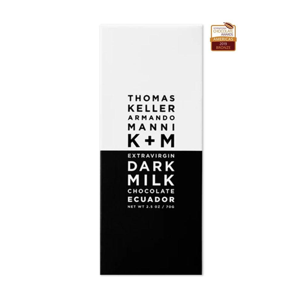 Balanced and nuanced flavors exhibit notes of mango and molasses. The K+M Extravirgin Dark Milk Chocolate Ecuador progresses smoothly from one flavor to the other.