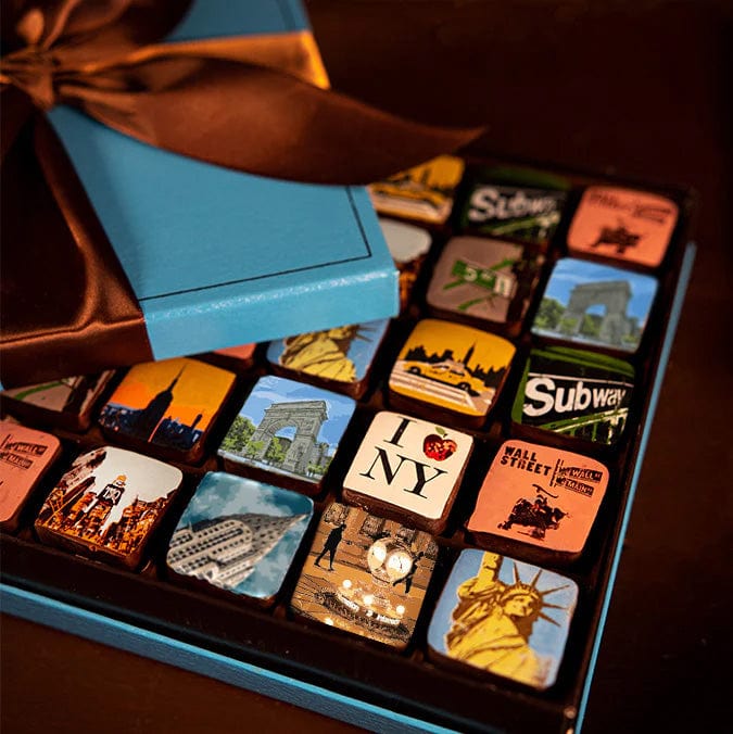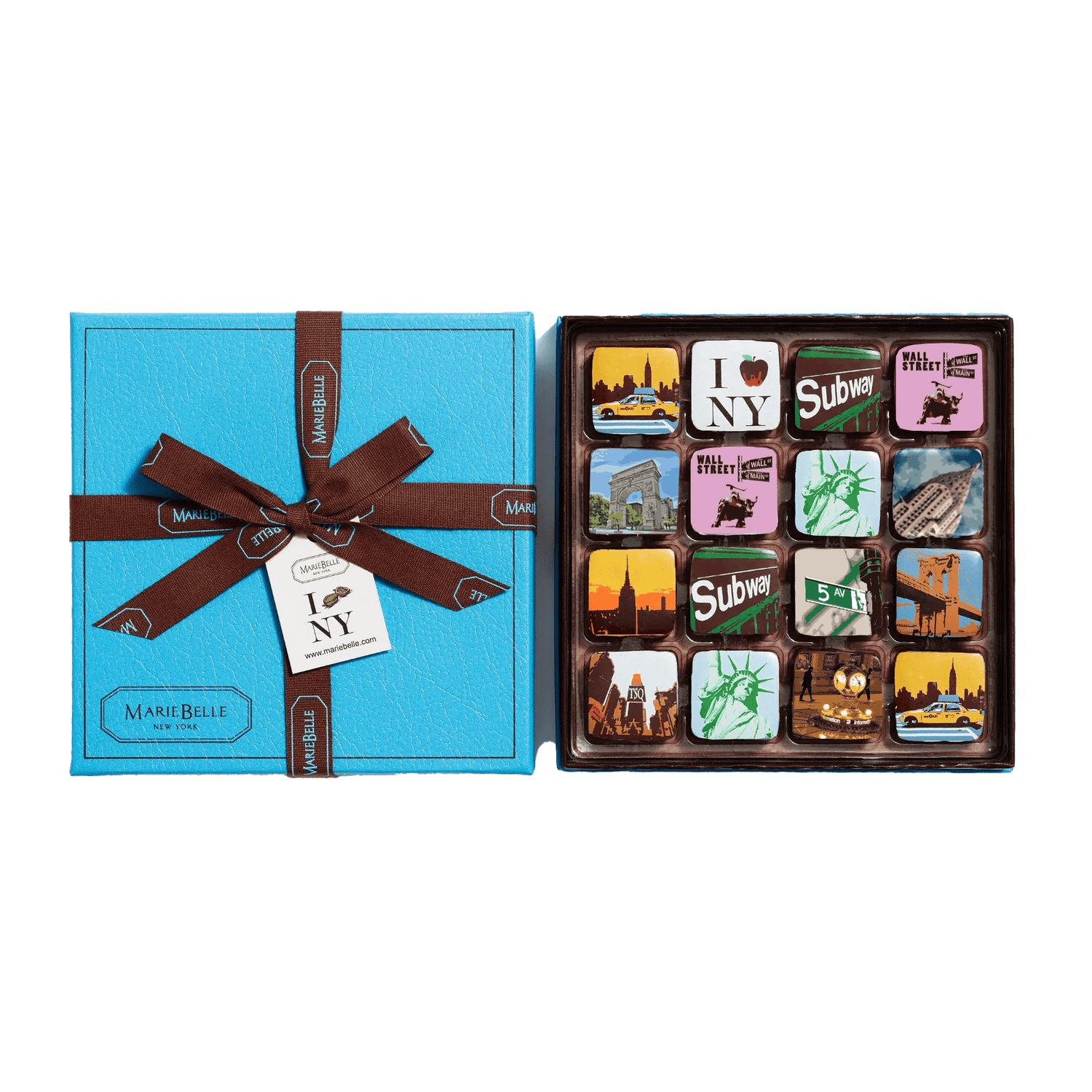 Take a bite out of the Big Apple with MarieBelle New York’s collection of chocolate caramels. Featuring 16 pieces designed with iconic images from across New York and Brooklyn, each is made from creamy dark chocolate and smooth caramel highlighted through various all-natural flavors including Fleur del Sel, Italian Espresso, and Chocolate Caramel. Beautifully arranged and artfully packaged inside our exclusive New York-themed box, it’s no wonder these chocolate caramels make for the tastiest souvenir in New York City.