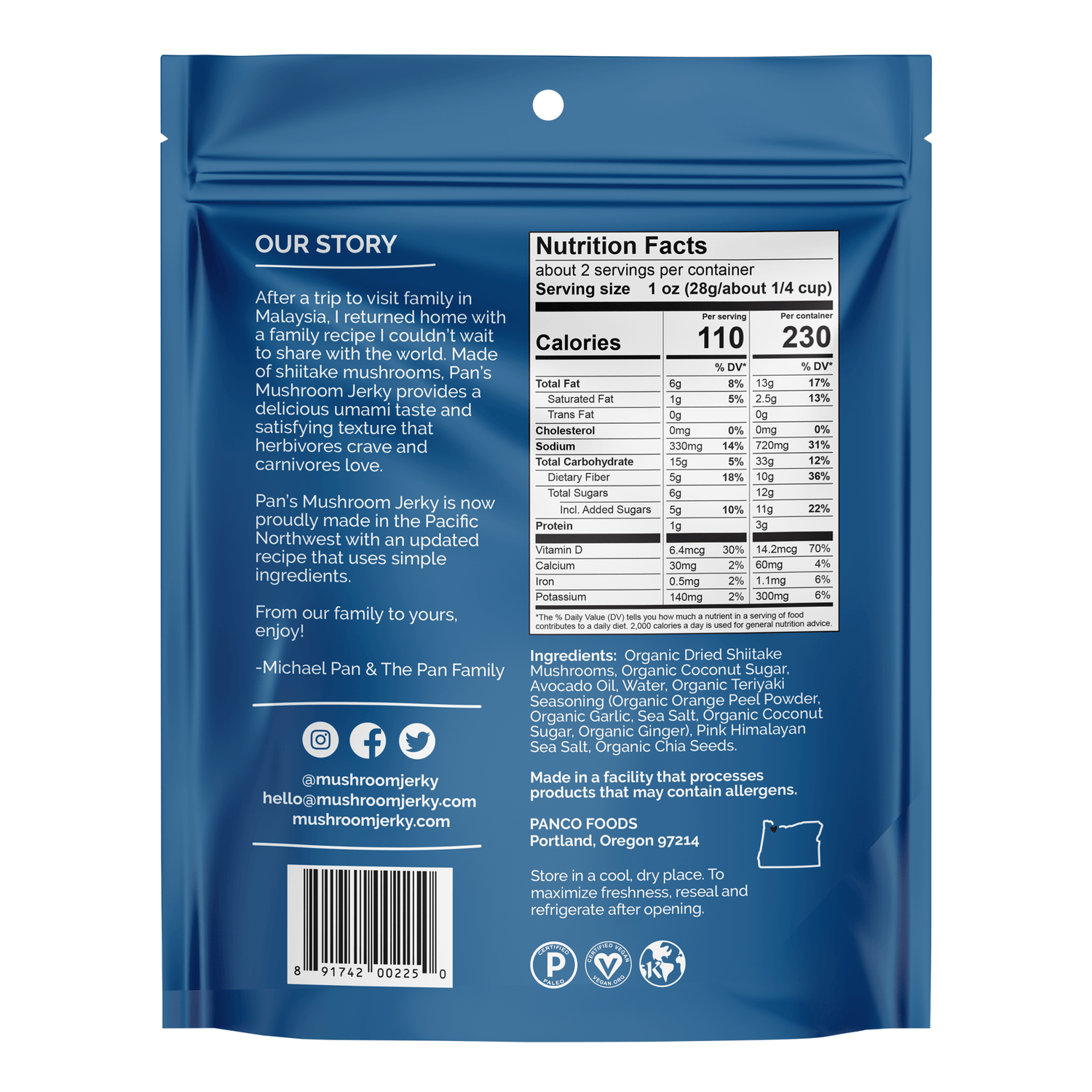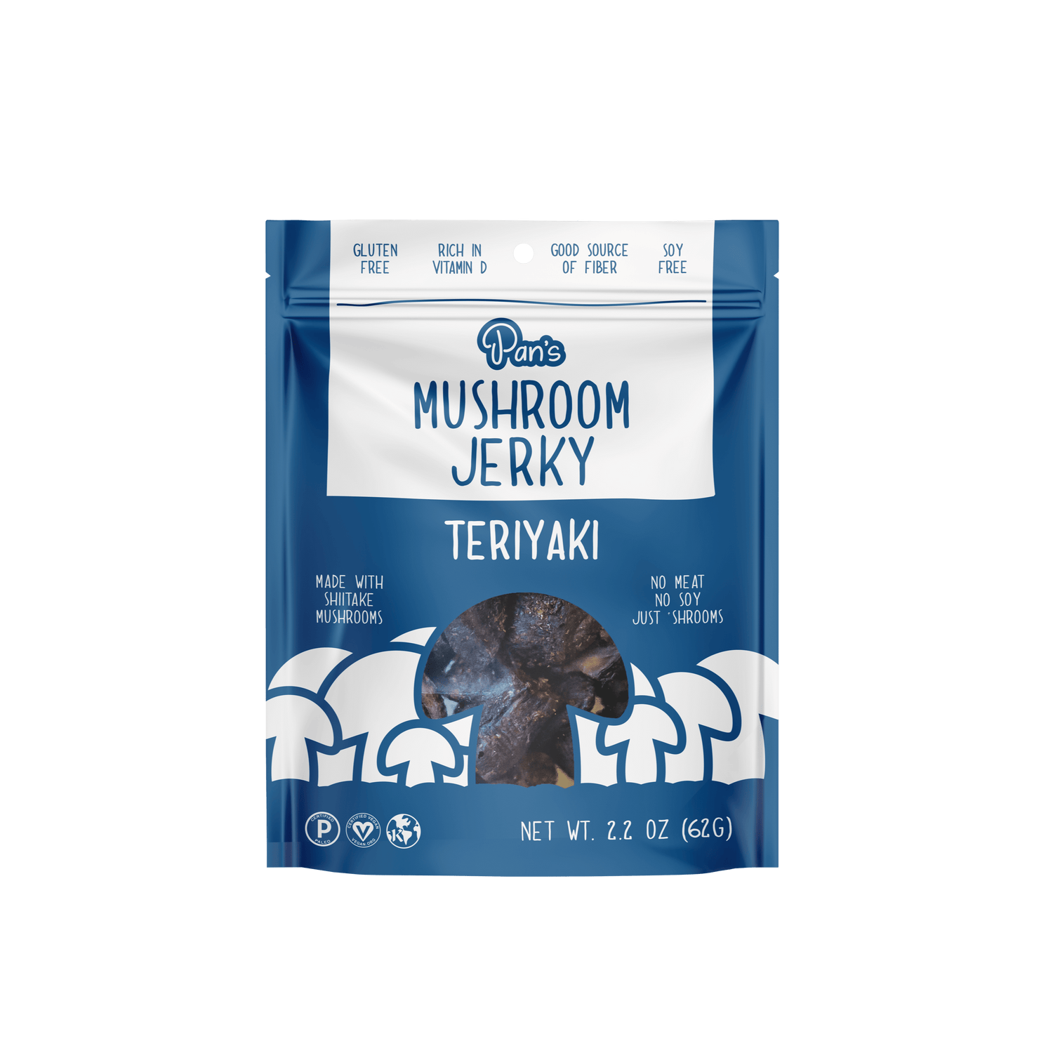 Made with shiitake mushrooms, Pan's Teriyaki Mushroom Jerky is plant-based, vegan, a good source of fiber and vitamin D, Paleo, Kosher, soy-free, gluten-free, and uses organic ingredients.