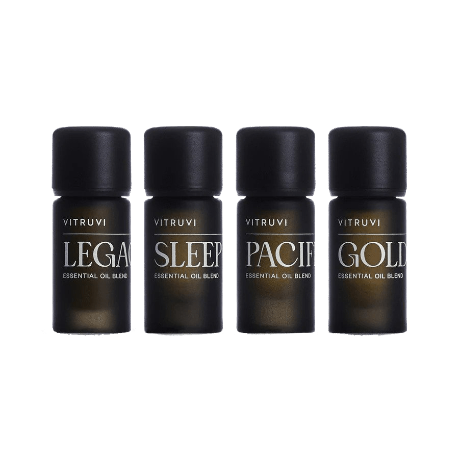 A bundle of Vitruvi's 4 most legendary essential oil blends: grounding Legacy, soothing Sleep, refreshing Pacific, and warm Golden. A perfect harmony of floral, citrus, herbal, and woodsy aromas.