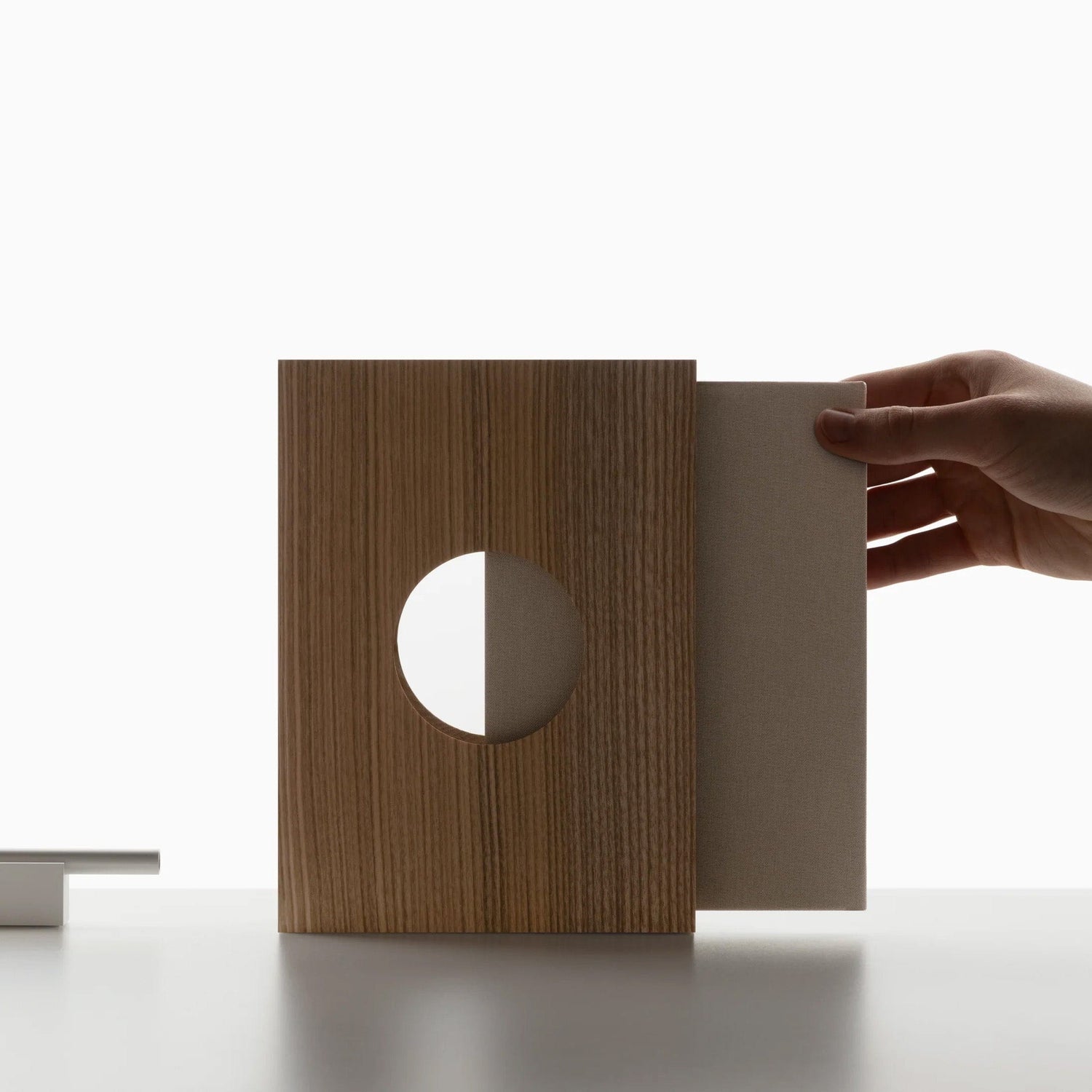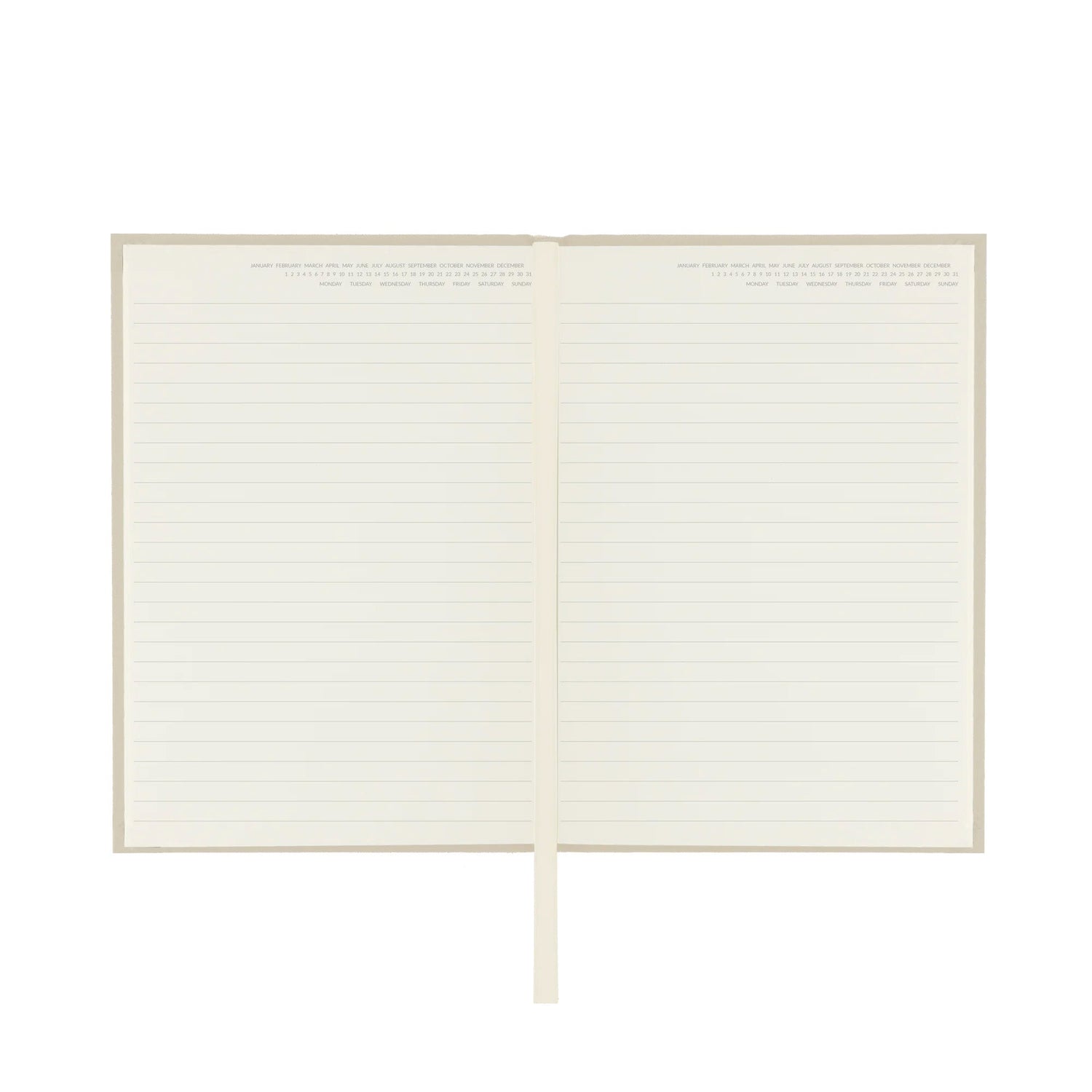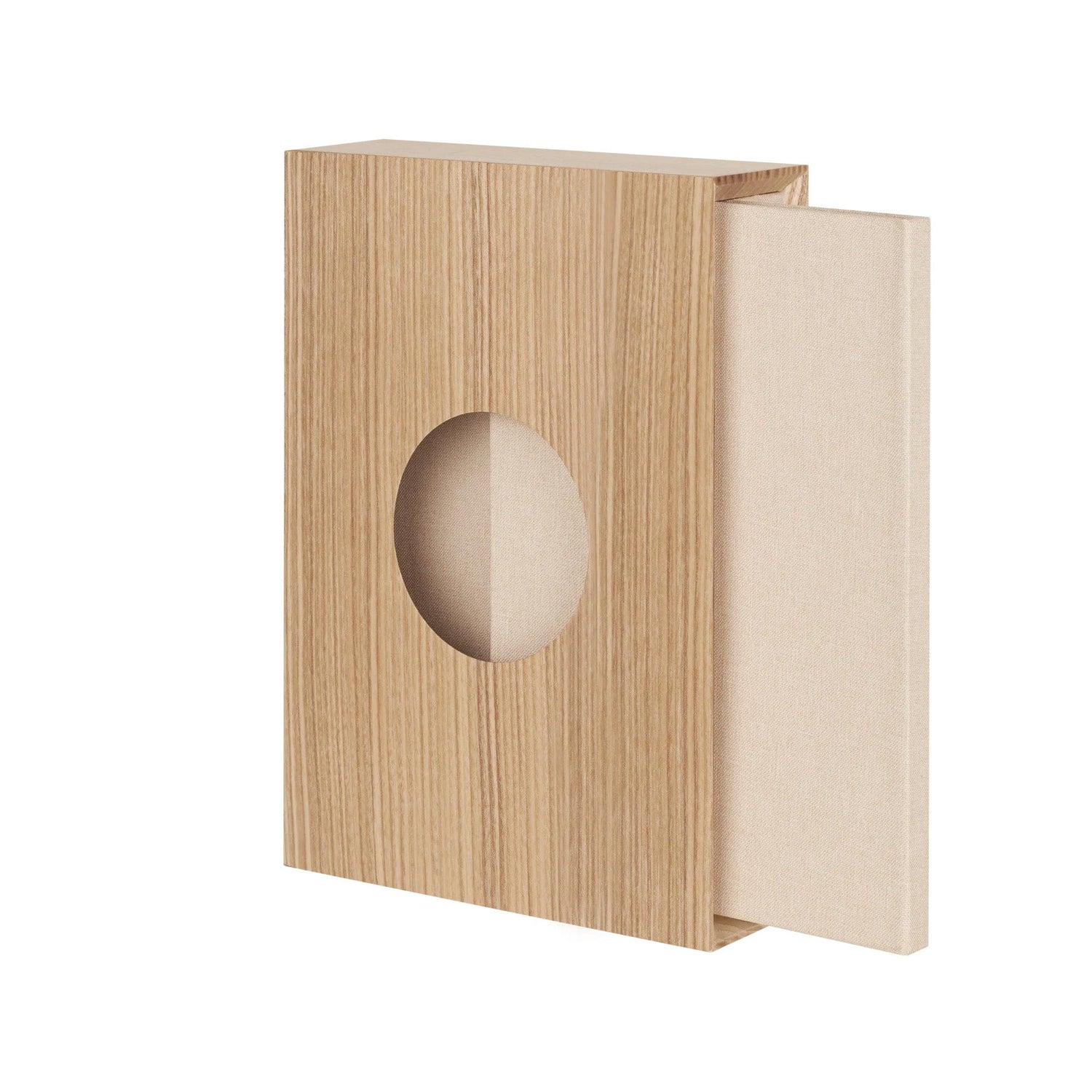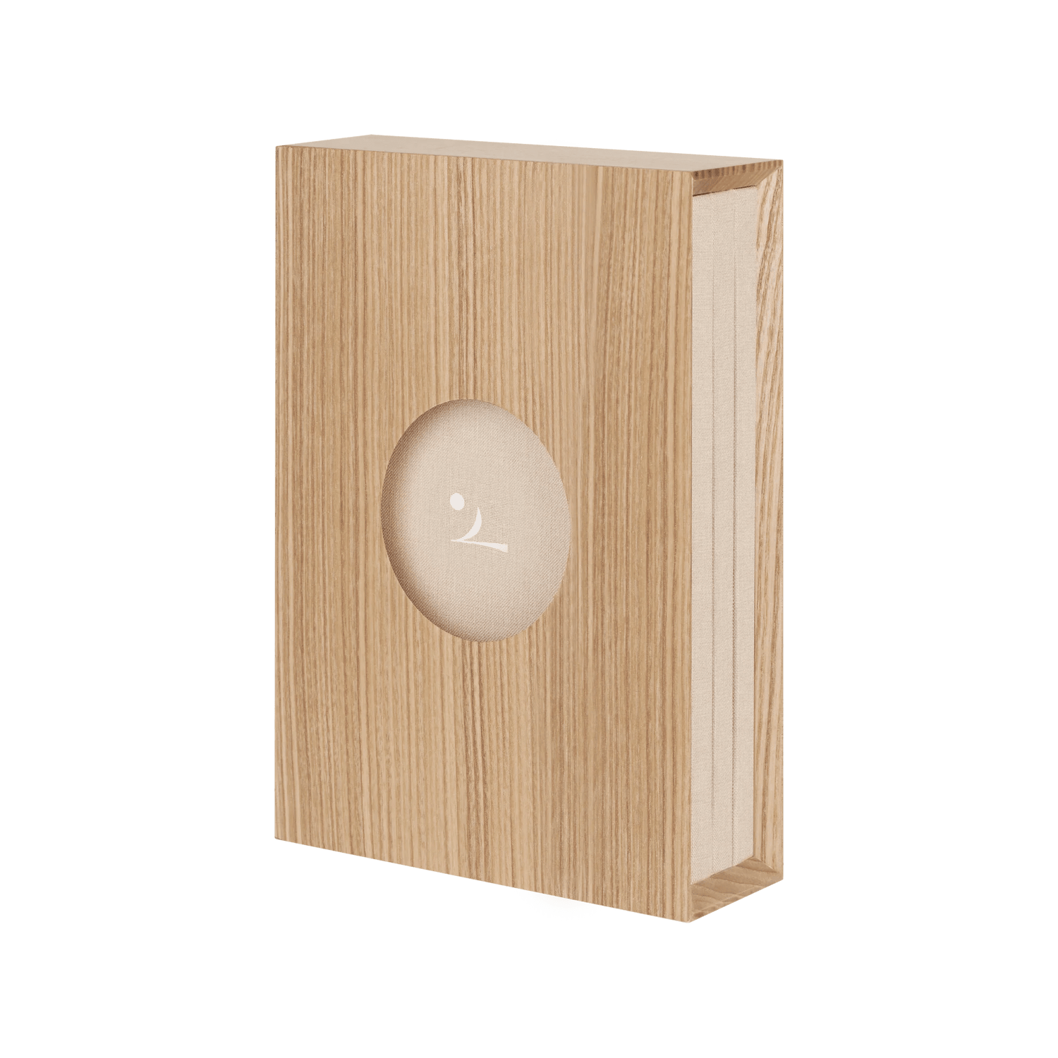 The Journal Set includes three fabric-bound notebooks, each with 100 lined pages headed with a calendar to record the date. The set lives in a solid hardwood case made from natural ash for display.